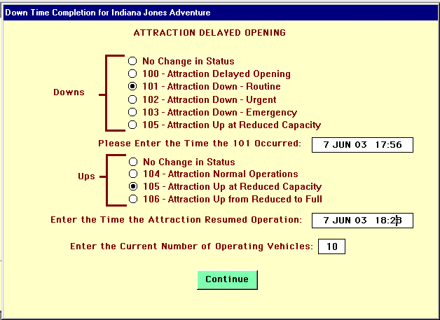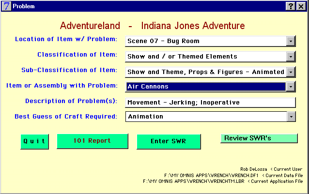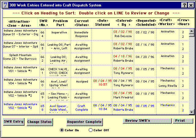The work request process employs several A.I. Techniques to make the task go very quickly. When an attraction goes down, the ride operators are under significant pressure. An automated system for entering and clearing downtime information was also included. |