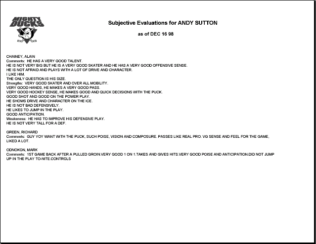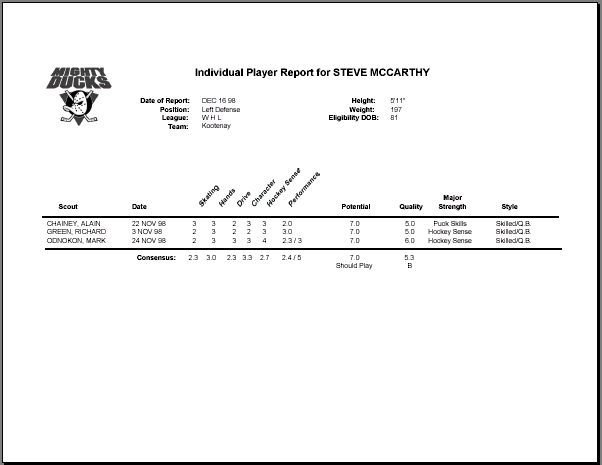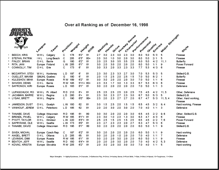 When millions of dollars are being paid for draft picks, you want to know as much as you can about all the candidates as possible. Each year, the Mighty Ducks print out a complete suite of reports that give them comprehensive information about the players and the teams they compete with.