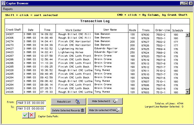 For example, you want to know all the work that Tony Nunez has done in a time window. Load the list for the time period. Sort the list by User Name. Highlight all of Tony's records and shift+click "Work Center." All of Tony's work is left now highlighted and sorted in work center order.