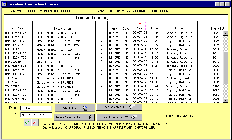 Once a transaction has occurred, it is immediately available to be browsed. The list is first loaded by date range. Sorting options included both ascending and descending sorts on all columns, plus the ability to select a group within a group for sorting. Hiding either selected or not selected lines. Further enhances your ability to review thousands of transaction quickly and easily.